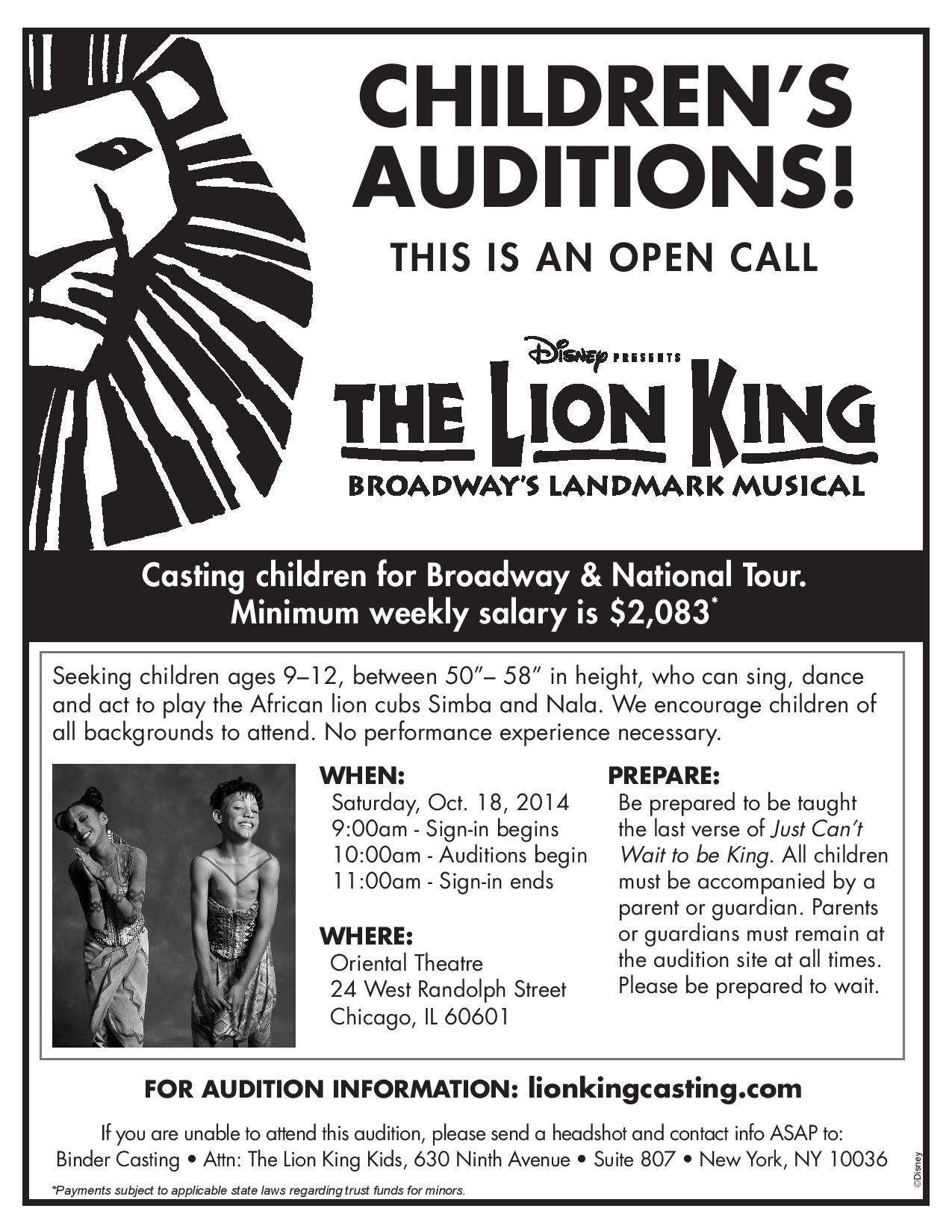 Open Auditions for Kids Disney “The Lion King Auditions Free , Sign up here for news on ticket presales, casting and more for the toronto production of disney’s the lion king. The organisers of the globally renowned.